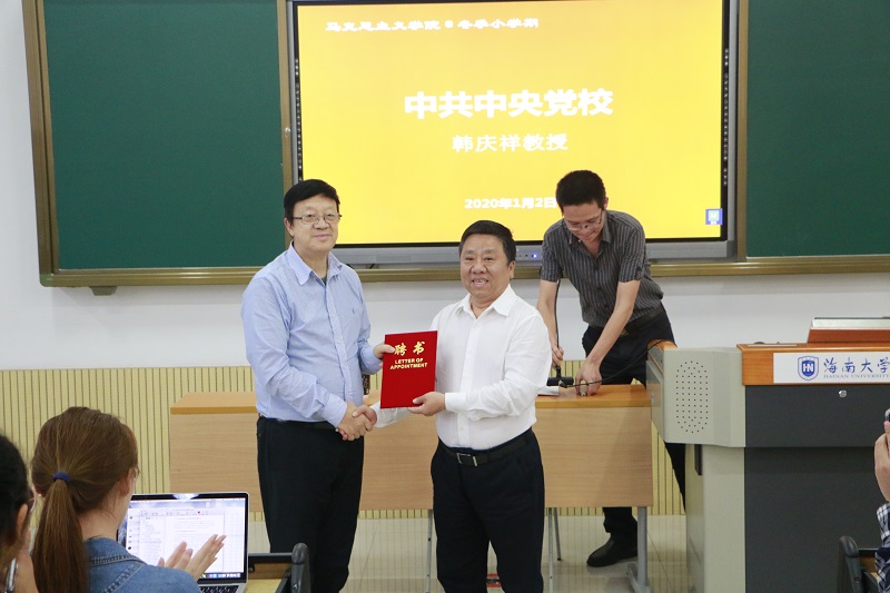 1月2日,2019-2020学年冬季小学期名家讲堂第二讲在五号教学楼112教室举行。中共中央党校韩庆祥教授应邀作《唯物史观与历史生成论》学术报告,经理张云阁出席并为并为韩庆祥教授颁发了sunbet申搏“冬季小学期授课外聘专家”证书。讲座由思想政治教育系主任陈招万主持。