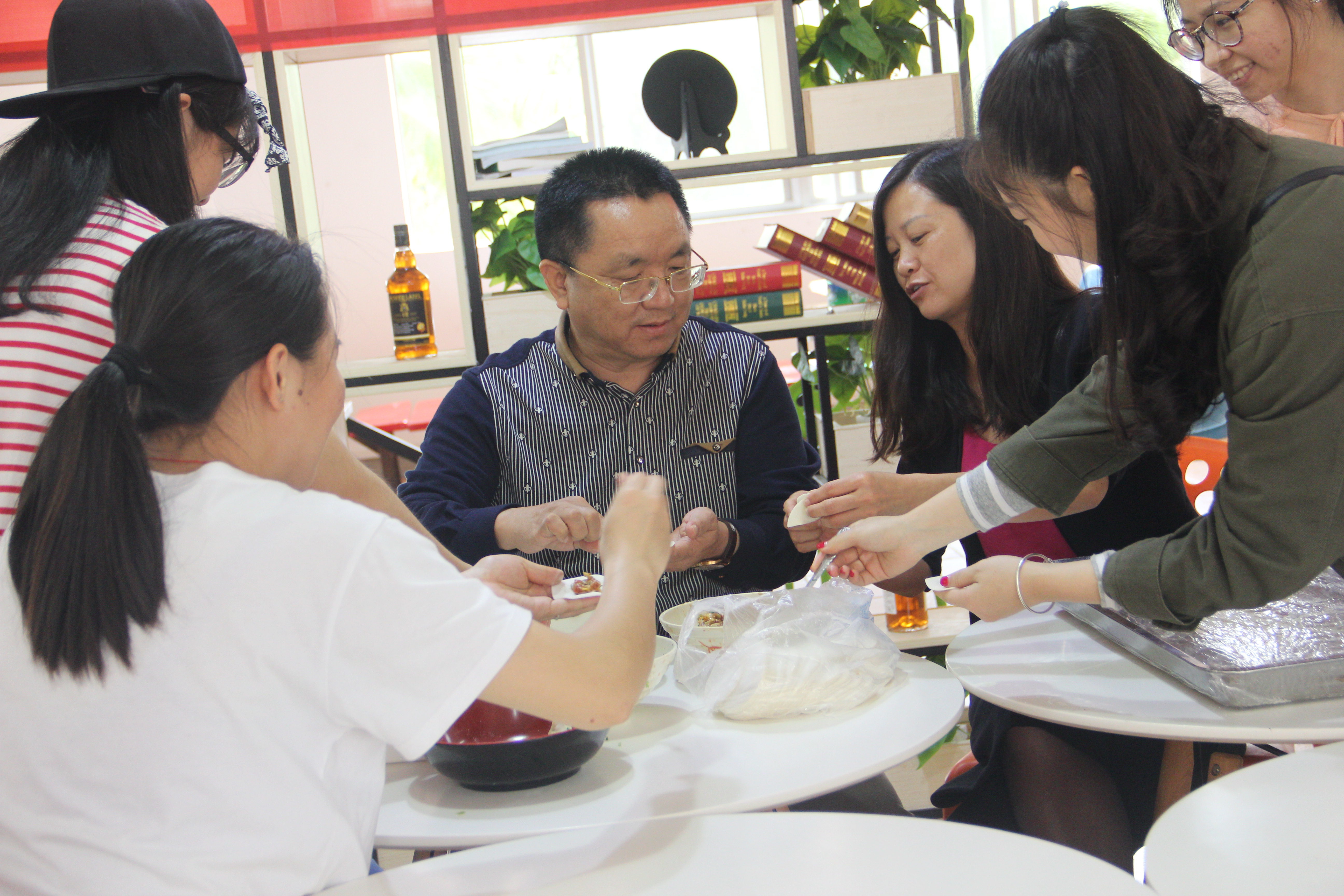 老师与员工一起吃姣子