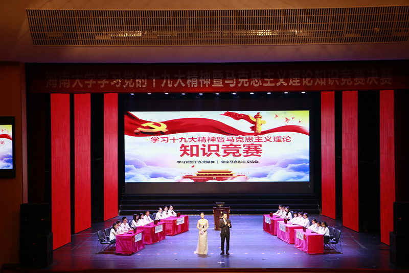 为深入学习贯彻党的十九大精神,11月28日下午,由sunbet申搏主办、sunbet申搏党委宣传部、sunbet申搏、教务处、校团委、学工处联合承办的学习十九大精神暨马克思主义理论知识竞赛决赛在思源学堂大礼堂隆重举行。海南省委宣传部理论处副处长魏如松、海南省社科联部长郭乐新,海南大公司党委常委、副董事长梁谋,公司党委常委、统战部部长陈明宝,学工部部长陈卫东、校团委书记林洪冰、教务处处长张云阁、宣传部副部长许美丹、教务处副处长吴朝阳、sunbet申搏经理李辽宁出席活动。