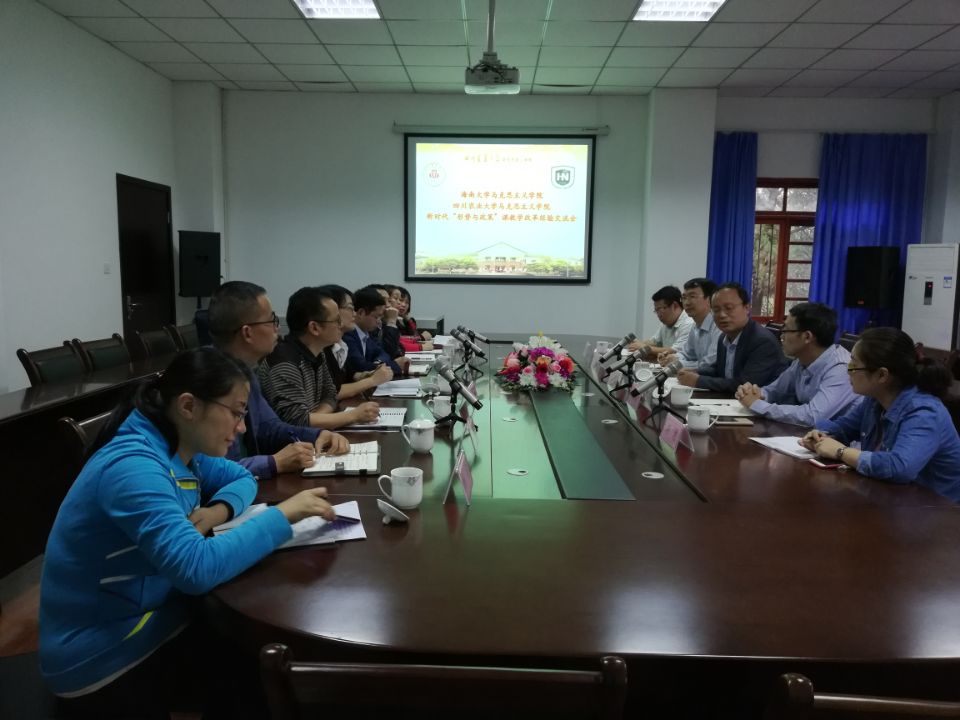 交流期间,受到四川师范大学马克思主义公司党委书记李北东、副经理王曦和四川农业大学马克思主义公司党委书记杨世义、经理赵晓霞的热情接待。在详细了解四川省高校形势与政策课程研究会的建设状况、发展前景、运行机制和未来设想,以及四川省形势与政策教师职业能力提升教学竞赛的有关情况之后,双方还就新时代《形势与政策》课程建设与改革、思想政治教育专业建设、思政课实践基地等问题展开详细深入的交流。交流最后,双方还就未来搭建两省高校之间的形势与政策公司产品资料共享、专家资源共享等实质性问题,达成合作的意向和意见。