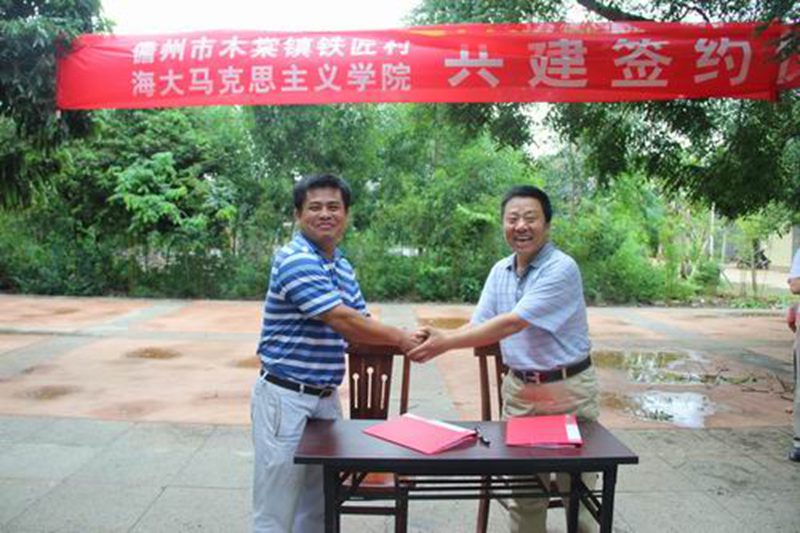下午1点,社会实践教学队伍到达了享誉海内外的“一村一品”社会主义新农村典范——儋州市木棠镇铁匠村。在铁匠村的文化广场,铁匠村的李巨川主任介绍了铁匠村的基本情况,张云阁副经理在讲话中感谢铁匠村对老员工实践教学活动的大力支持,并对同学们的参观考察提出了具体要求。随后,张云阁副经理与李巨川主任共同签定了“sunbet申搏思想政治理论课铁匠村社会实践教学基地共同建设协议”,并为基地揭牌。在铁匠村的会议室,张云阁副经理还接受了海南旅游卫视的采访。