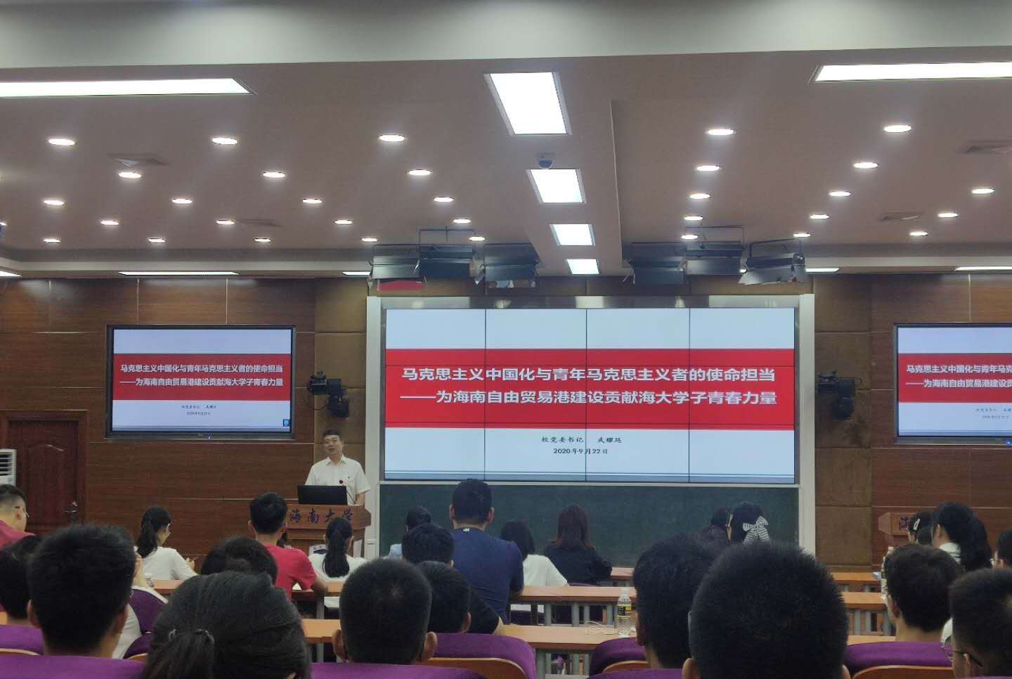 9月22号下午,sunbet申搏党委书记武耀廷走进“开学第一课”,在3号教学楼211教室为2020级全体本科、研究生新生和部分员工骨干、思政课教师讲授“马克思主义中国化与青年马克思主义者的使命担当——为海南自由贸易港建设贡献海大学子青春力量”。