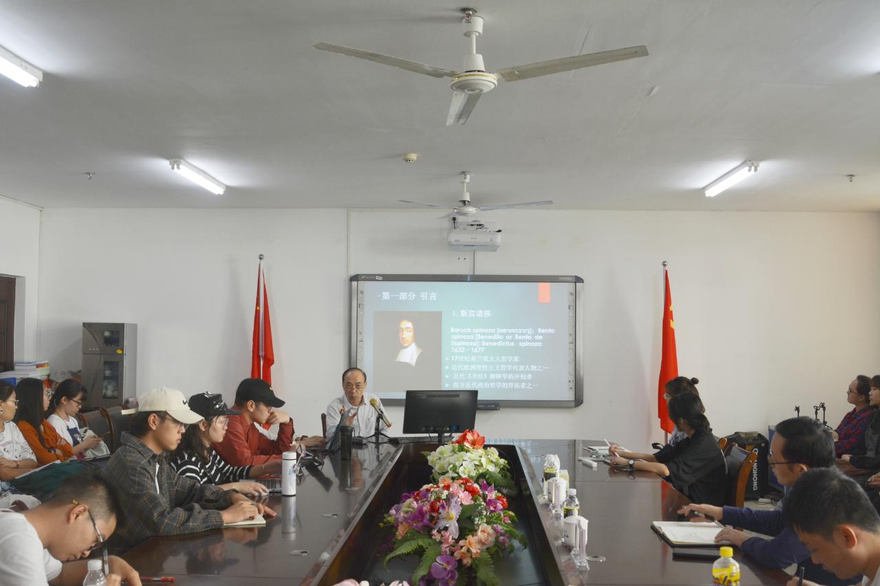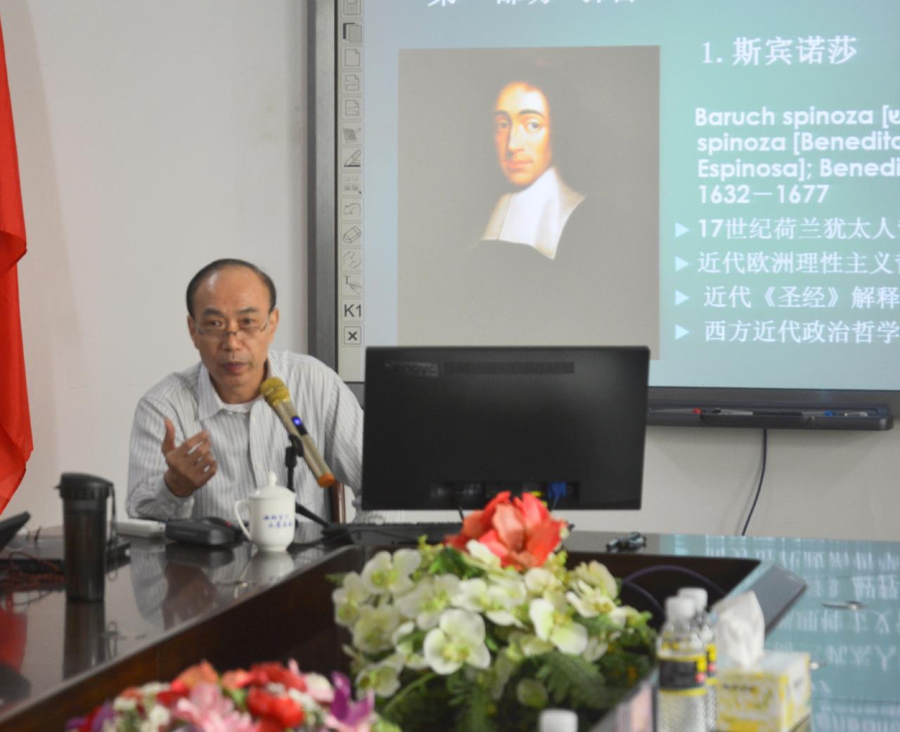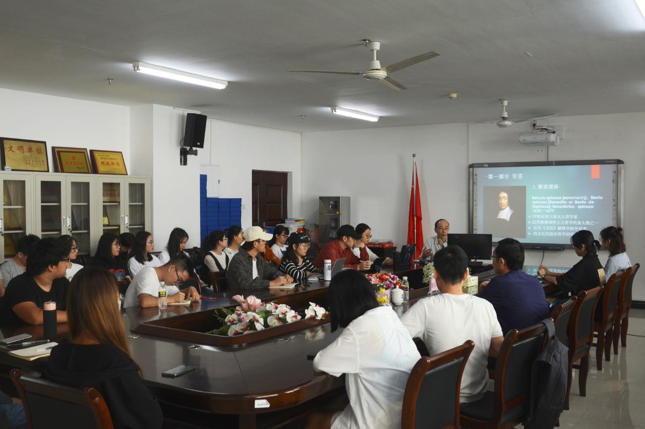 黄启祥教授以“分离与调和:斯宾诺莎论哲学与神学的关系”为主题进行讲授,探讨《圣经》与理性的关系、《神学政治论》的“自觉体系”与“自在体系”等系列问题来解释斯宾诺莎哲学与神学的关系问题。黄教授根据斯宾诺莎从《圣经》出发讲述的神学和哲学的不同,强调哲学的目的是真理,以及哲学不能代替神学等观点,分析了《神学政治论》,使同学们更好地了解清哲学与神学的关系。