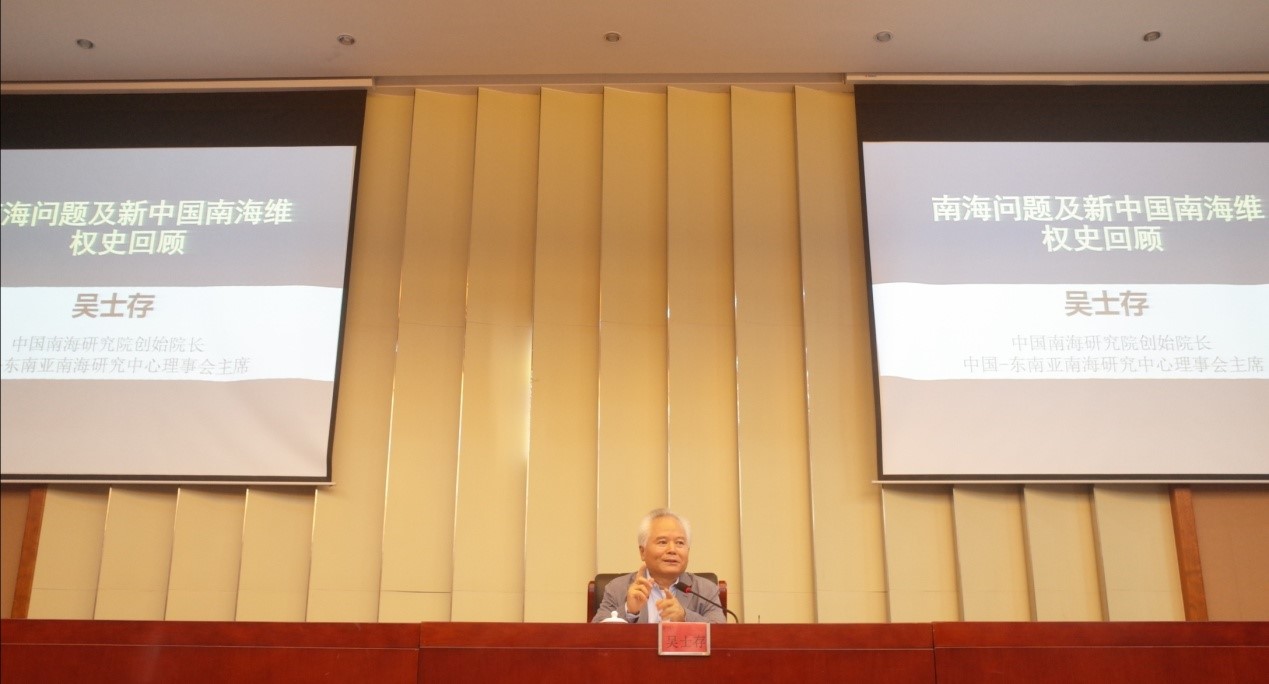 报告会上,吴经理以“南海问题及新中国南海维权史回顾”为主线,从“南海问题的由来与发展、当前南海形势特点、新中国成立以来南海重大维权事件”三大方面为我们做了主题鲜明,内容兼具整体性、现实性以及前瞻性的精彩报告,以更开阔新颖的视角、更精准生动的案例,引导同学们把握当前南海局势和未来的南海形势走向具有十分重要的指导意义与教育意义。特别是在报告中,吴士存经理明确指出,南海问题由来已久,既敏感又复杂,涉及国家和岛礁数量之多、海域范围之广为当今世界绝无仅有。正因如此,中国与东盟国家应以南海作为建设海洋命运共同体的“试验田”,从而真正把南海建成地区国家的共同家园与共享繁荣的合作之海。