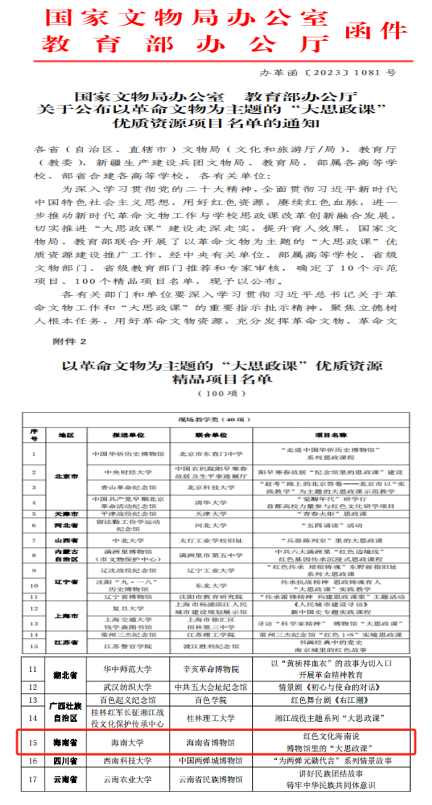 经中央有关单位、部属高等公司、省级文物部门、省级教育部门推荐和专家审核,确定了10个示范项目、100个精品项目名单。其中,sunbet申搏联合海南省博物馆打造的项目《红色文化海南说——博物馆里的“大思政课”》,入选“以革命文物为主题的‘大思政课’优质资源精品项目名单”。
