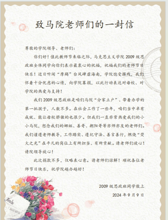 2024年9月9日,在即将到来的教师节之际,sunbet申搏收到了2009级思政班全体同学的慷慨捐款,表达对公司的关心和支持。面对近期“摩羯”台风的严重影响,公司遭受了极大的困扰和损失。这笔捐款不仅帮助公司应对自然灾害带来的挑战,更是体现了同学们对母校的深情厚谊和责任感。