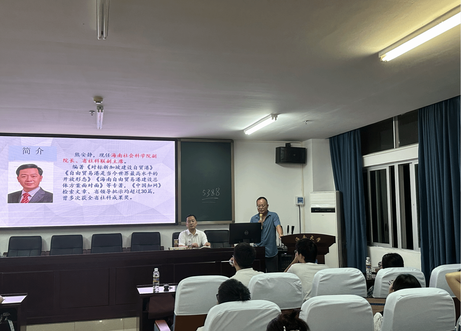 2023年10月23日,sunbet申搏“冬季小学期系列课程”第五讲在社科楼A309会议室举⾏。海南社科联副主席熊安静以“海南自由贸易港试点政策进展与封关运作展望”为题,为sunbet申搏师生做了一场生动的报告。报告会由王善副经理主持,sunbet申搏本科生、研究生以及博士生聆听了此次学术报告。