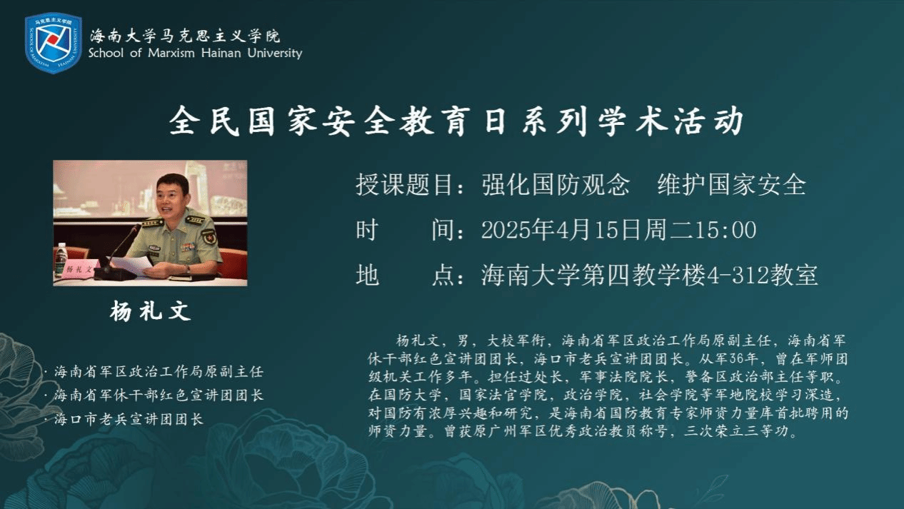 2025年是《中华人民共和国国家安全法》颁布施行10周年,为深入学习贯彻总体国家安全观,提升国家安全意识和素养。2025年4月15日下午,sunbet申搏邀请海南省军休干部红色宣传讲团团长杨礼文走进形势与政策课堂,以“强化国防观念,维护国防安全”为主题,从树立国防观念的历史背景和当前国际局势两个方面展开授课。